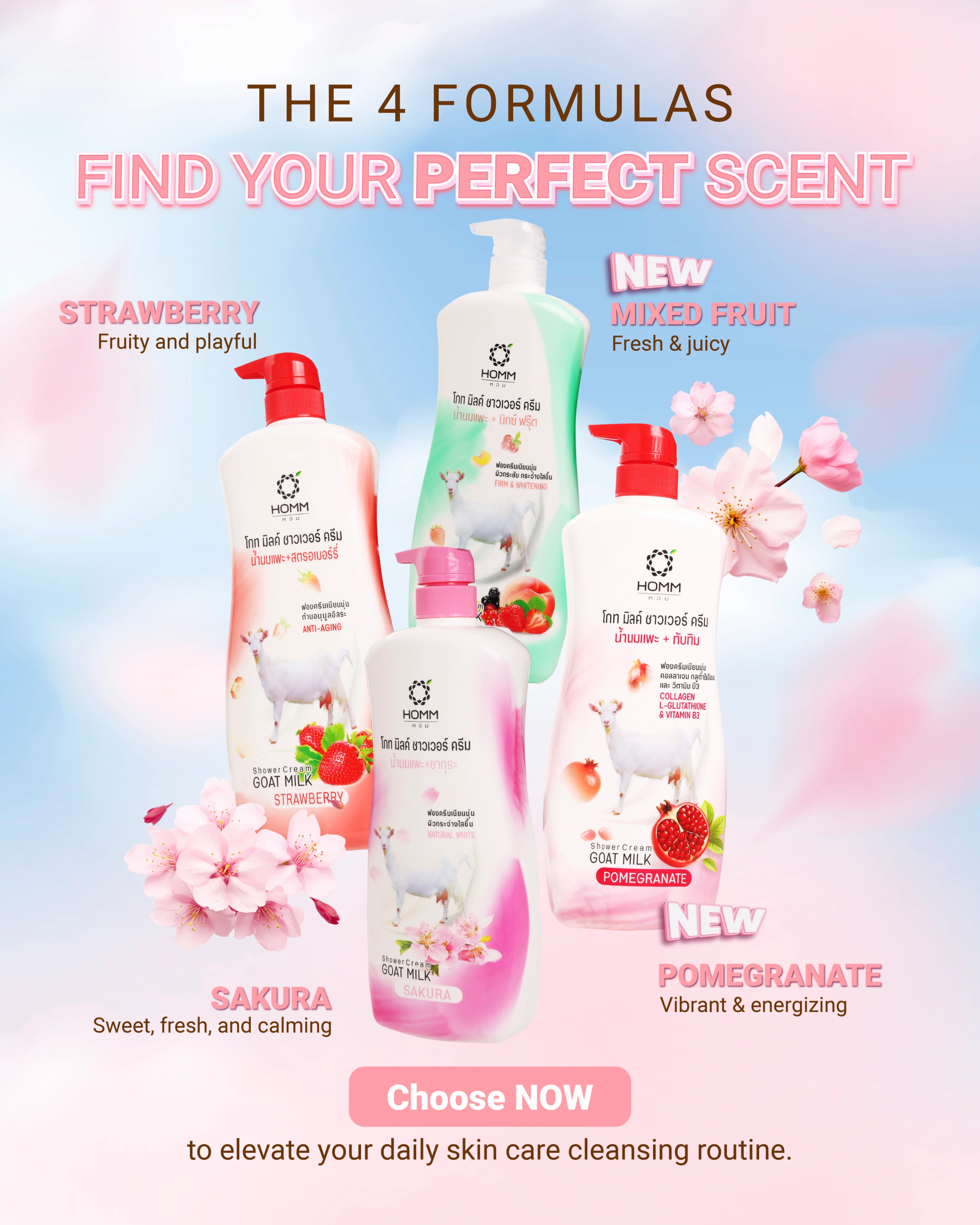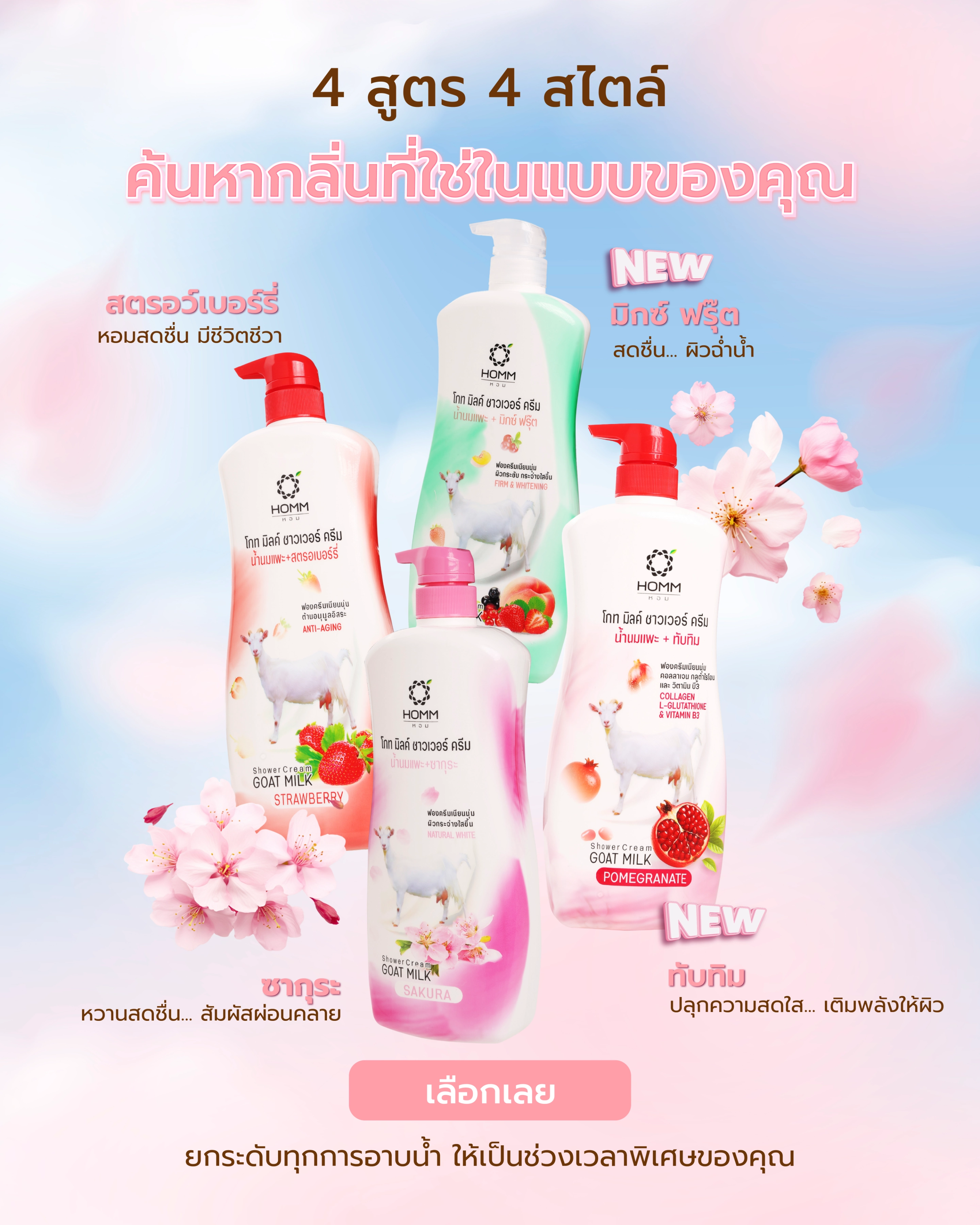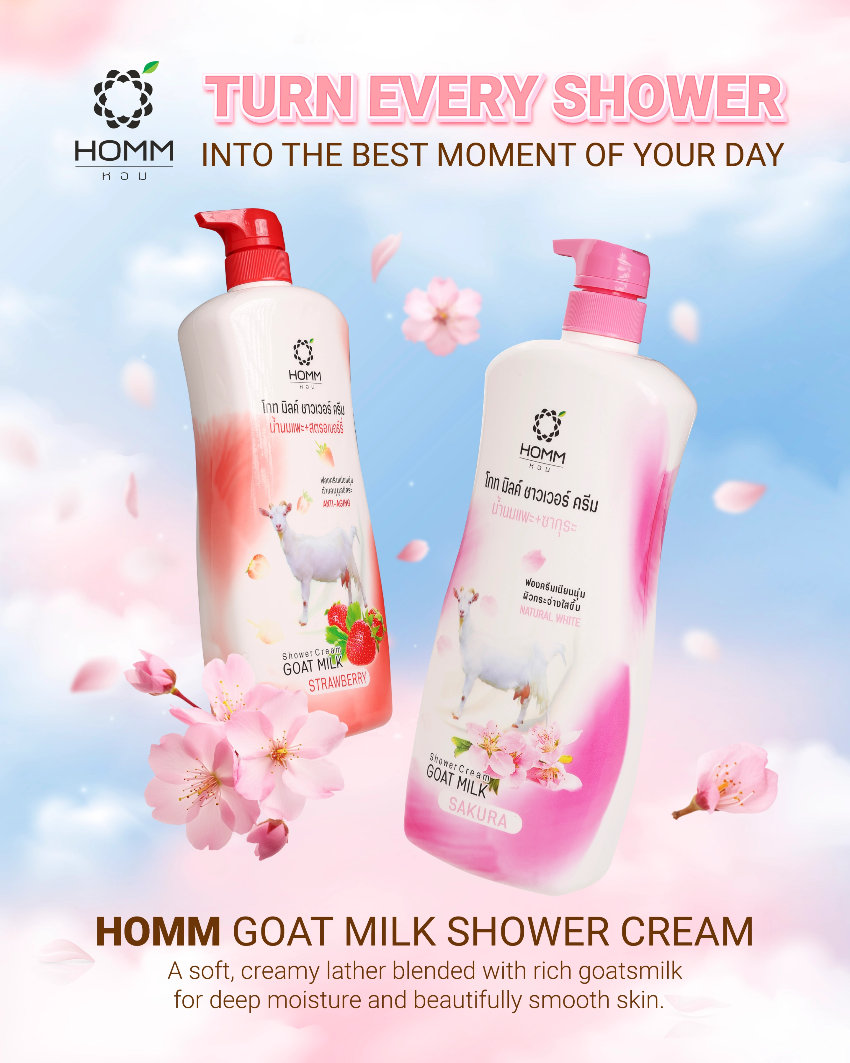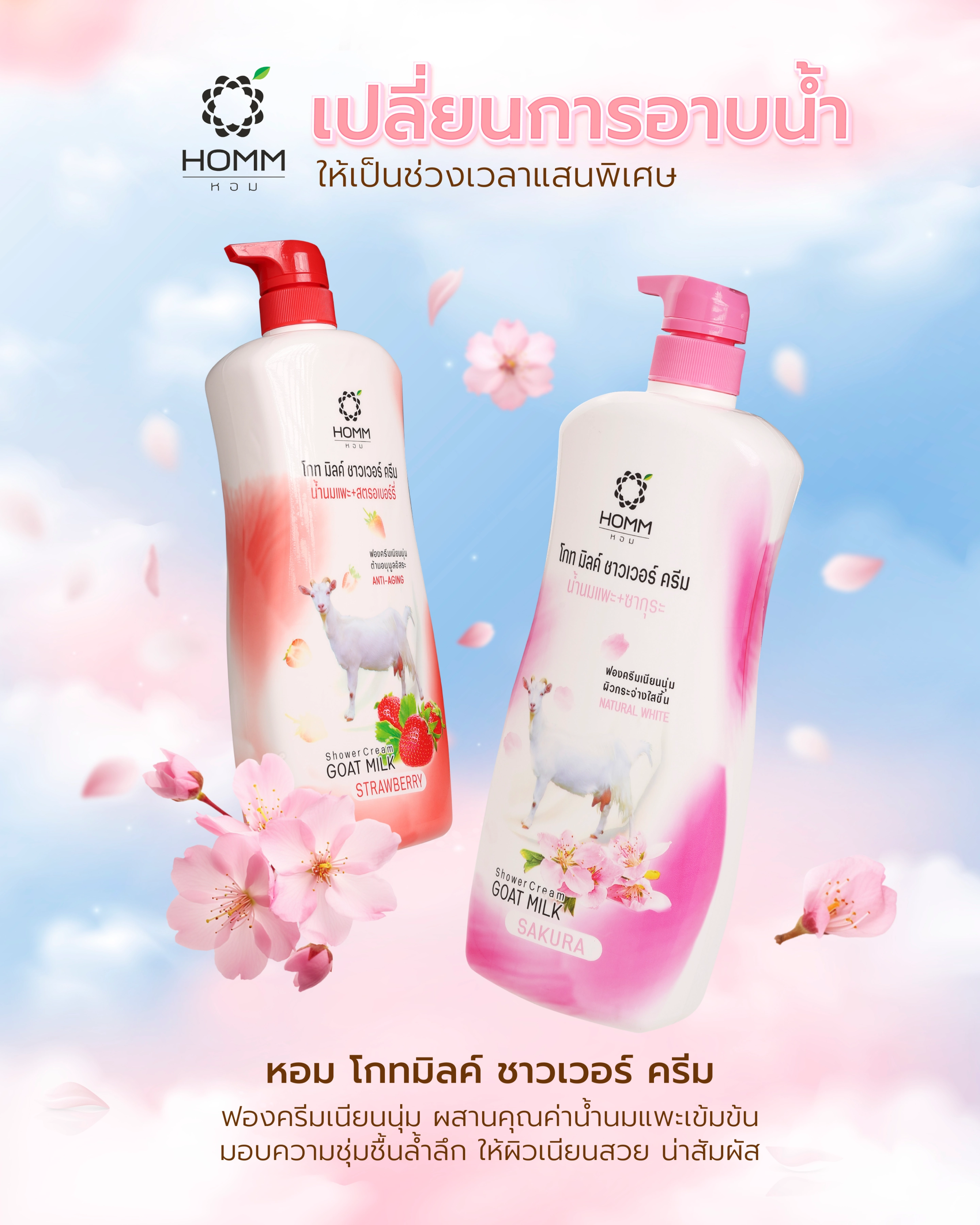 หอม โกทมิลค์ ชาวเวอร์ ครีม มีทั้งสูตรสตรอว์เบอร์รี่และซากุระ ครีมอาบน้ำนี้บำรุงและให้ความชุ่มชื้นแก่ผิว ทำให้ผิวนุ่มและเปล่งปลั่ง เหมาะสำหรับใช้ทุกวัน มีขวดปั๊มที่สะดวกในการใช้งาน